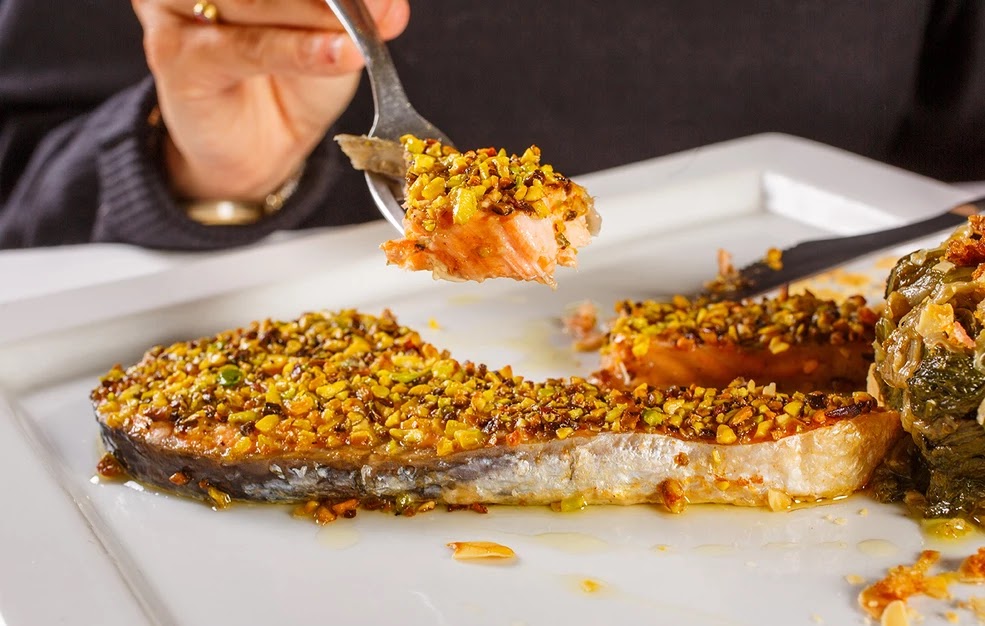 - Απλώστε το μείγμα φιστικιών σε κάθε φιλέτο και πατήστε το καλά.